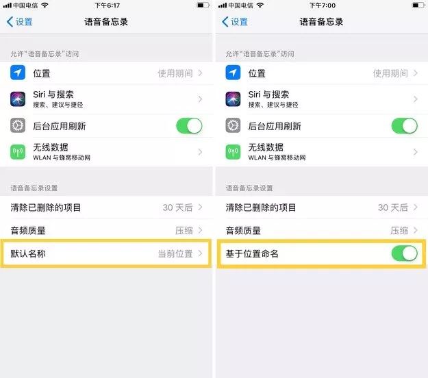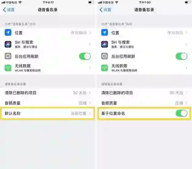 在 iOS 12 中新增的语音备忘录堪称测试版系统的宠儿,在每个版本中都有新的变化。在最新的 iOS 12 PB3 中,语音备忘录设置中最后一项从「默认名称」更改为「基于位置命名」。如在 iOS 12 PB2 中,新建语音备忘录的默认名称可以选择为当前位置或录音编号,PB3 中若关掉基于位置命名,新录音就会以录音编号命名。
