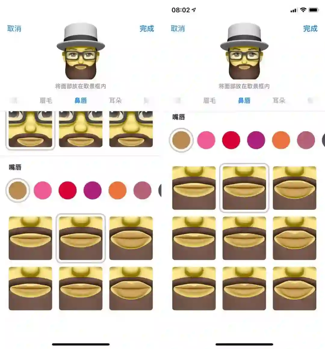 Memoji 中的鼻唇选项中可选的嘴唇从 PB2 中的 6 个增加到现在的 9 个。