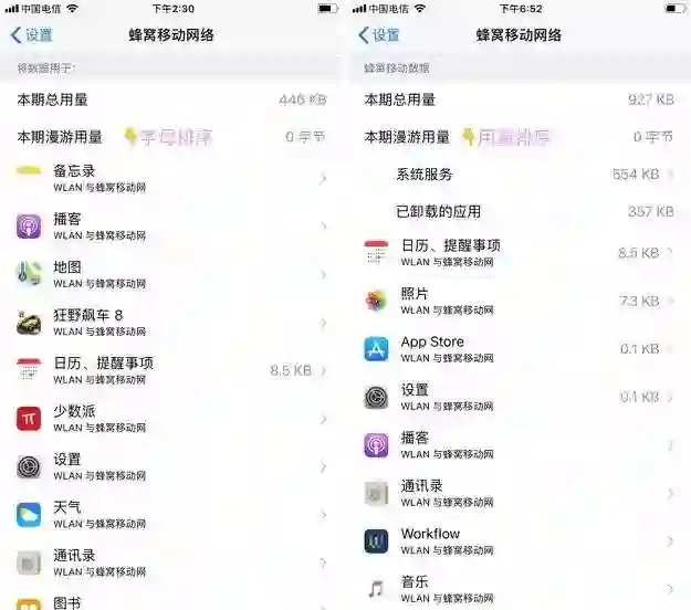 在「设置 - 蜂窝移动网络」中,其下方「将数据用于」的 App 排序方式,从字母顺序排列变更为按照蜂窝数据流量排列,查看哪个 App 是烧流量大户现在一目了然。
