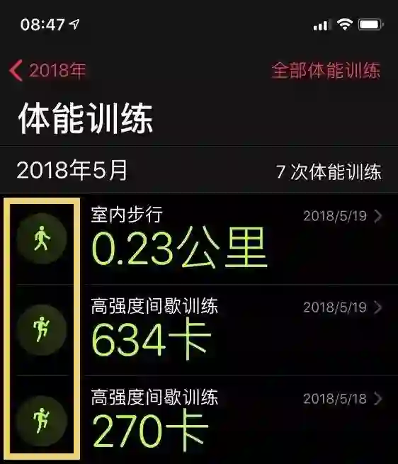 在原生健身记录 App 的体能训练页面中,在每一项运动记录前,新增了该项运动的图标,现在锻炼后想查看自己的健身情况更加直观和轻松了。