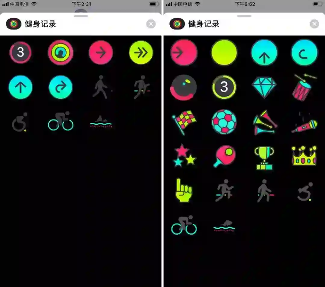 在 iOS 12 PB2 中新增的健身记录动态贴纸,在本次又新增了不少新表情,比如足球、彩旗、奖杯、喇叭等等,无需锻炼获得成就就可使用。