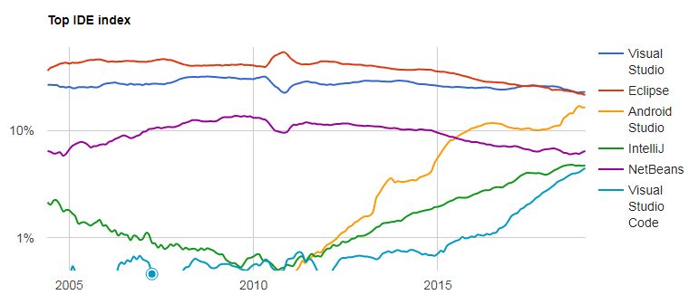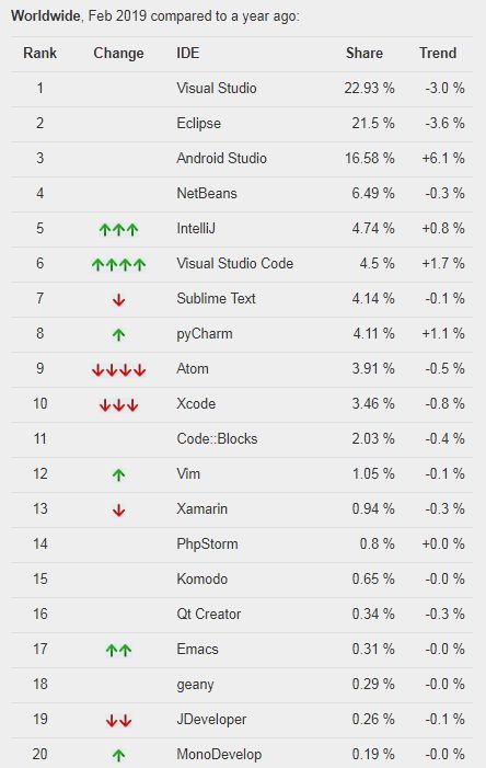 不过官方数据显示,在全球范围内,虽然 Eclipse 排名靠前,但事实上近年来其占比已处于下滑趋势,它过去 5 年的占比下降了 15.7%,Visual Studio 则是当之无愧最受欢迎的 IDE,而 Android Studio 在过去 5 年中增长最多,其占比增加了 13.2%。