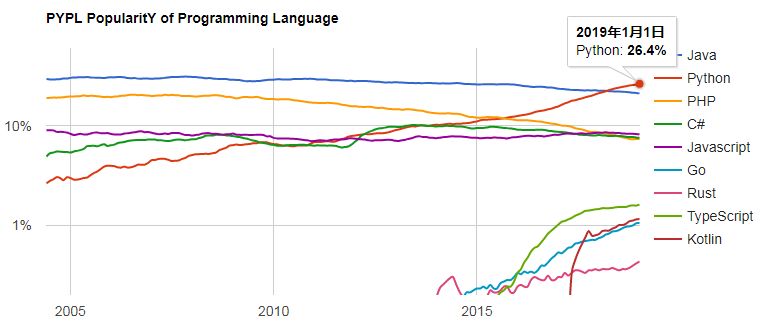TOP 5 编程语言和新兴的热门编程语言 PYPL 指数趋势图