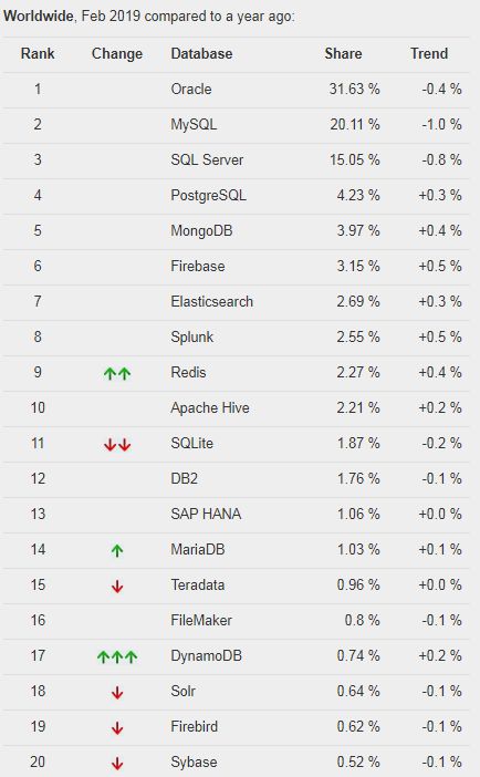 下面继续看看数据库的流行度又是如何,数据库排行榜如下: