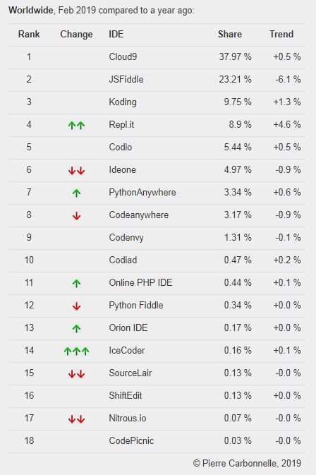 最后看看 ODE(Online IDE),由于在线 IDE 在国内的流行度不是很高,这里就不细说了,我们看看排行榜: