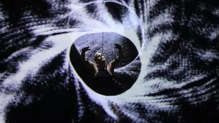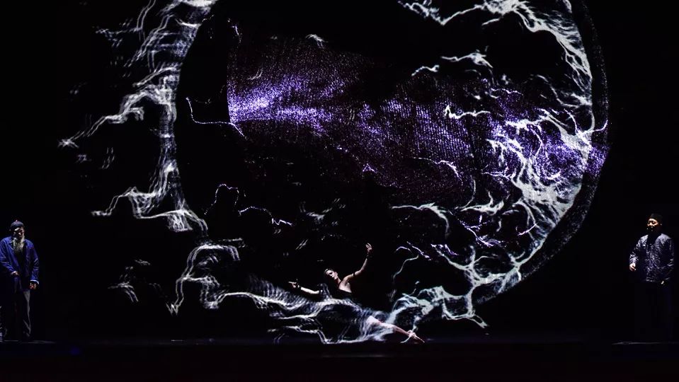 第三场《花儿·影》是个小高潮,准确地说,是极大地激起了好奇心。我看到的是一位舞者,浮在半空中,她的四面八方,涌起星系、银河,或者光束和黑洞,说不清是什么,可宛若身处广袤的宇宙,动荡不安,可又沉静浩淼。我的眼睛仿佛在欺骗我,我看不到制造宇宙空间感的两块巨大屏幕,也看不到助舞者悬浮的装备。