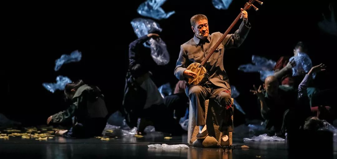 《对话·寓言》的开场是一段陕北曲调唱书,这是北方盛行的说唱艺术,让人想起信天游里的情歌对唱,曲牌名叫“刮大风”。我坐得高且远,起初看到的是,舞台上空飘下许多白色纸片,悠游而下,并不径直落地,而是随着“大风”,忽而又起。仔细听,有细微的嗡嗡声,是无人机。它们总共有66台,自重才45克,白色纸片则是塑料袋,它们在程序安排下精确飞行。