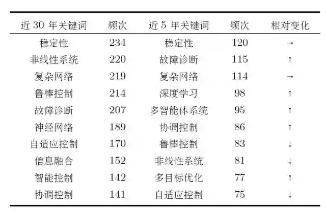 作者统计了1988-2017年所有资助项目关键词共现频次,关键词图谱如下图所示,具体哪下表所示。从表中可以看出控制系统的稳定性分析是控制理论近30年主要研究热点,而非线性系统、复杂网络、鲁棒控制、故障诊断、神经网络与自适应控制紧随其后,近5年来,与人工智能、大数据等热点密切相关的深度学习、多智能体系统、协调控制、多目标优化等上升明显,而鲁棒控制、非线性系统、自适应控制等传统自动化研究方向出现相对下降的趋势。