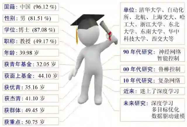 30年的数据分析表明,自动化领域正在蓬勃发展,研究人员规模、研究成果数量、基金资助数据都在稳步提升。许多研究人员在自然基金的资助下快速成长,正在成为自动化研究领域的重要力量。文中根据以上数据静态和趋势分析结果,绘制自动化最具代表性的研究人员的数据画像,如下图所示。图中的年龄为自动化领域资助项目负责人的平均年龄。