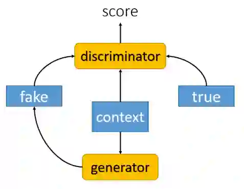 在系统流程中,生成器(generator)读入长度为四句话的故事前情(context),然后生成一个伪样本(fake)。判别器有两个输入,其一是故事前情(context),其二是训练正例(true)或是生成器(generator)产生的伪样本(fake),判别器将输出概率值以表示样本能够从故事前情中推导得到的可能性。