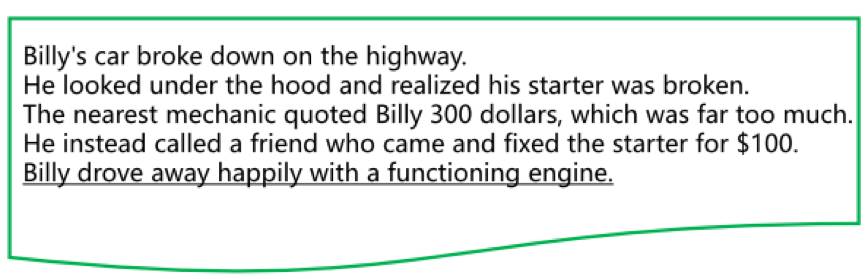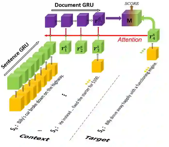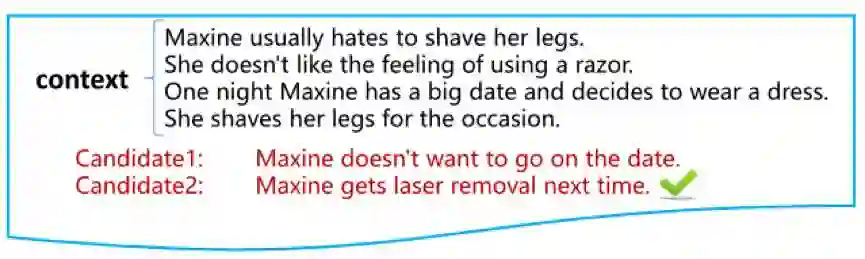 故事型常识阅读理解(Story Cloze Test (SCT))是近几年新提出的一个文本理解任务,在这个任务中,给定背景的四句话,我们需要从两个候选句子中选择出哪一个可以被前四句话推导出来。要完成这个任务,我们需要深入理解背景的四个句子,进行推理。