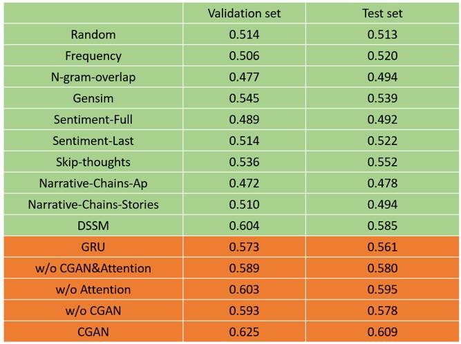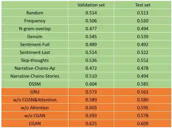 随着判别器和生成器不断迭代的训练。最后得到的判别器可以判断当前输入的句子是不是可以被背景四句话推出。因此在测试阶段,本工作直接用判别器来输出一个概率来给出两个候选的可能性。这也是本工作的亮点之一,和以往 GAN 的应用不同,对抗过程中提升的主要目标是一个高性能的判别器,生成器在模型中仅起到一个辅助作用。
