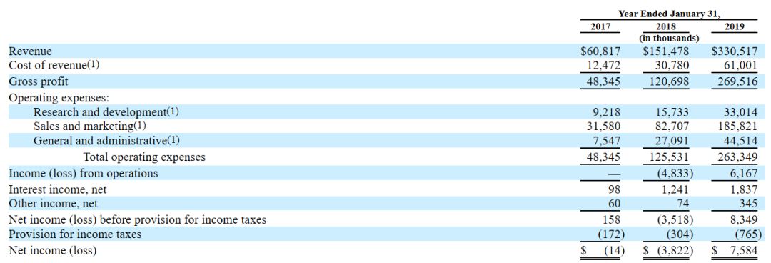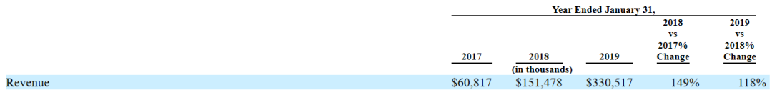 业务的增速也反映在营收规模的变化上。截至2017年1月31日、2018年1月31日和2019年1月31日的财年,Zoom的收入分别为6080万美元、1.515亿美元和3.335亿美元。