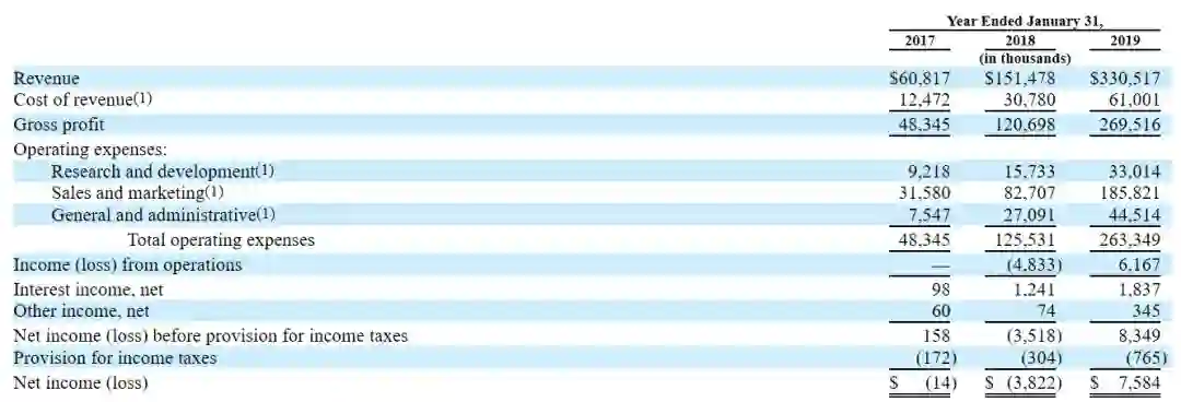 截至2017年财年和2018年财年,净亏损分别为0万美元和380万美元,截至2019年财年净收入为760万美元,反映了Zoom基本能实现盈亏平衡,并在过去一个财年已取得利润。