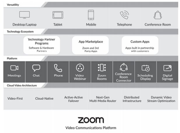 Zoom主要从事To B的业务,为客户提供企业云视频会议解决方案。其产品包括Zoom,提供高清视频、音频、协作和聊天系统;Zoom Rooms,提供视频会议室的功能;Zoom Webinar,网络研讨会功能;Zoom H323/SIP,提供Cisco、Polycom、华为等H323设备接入;Zoom集成开发,负责混合云、私有云、API和SDK开发;Audio语音,企业多方电话会议系统,打造多元视频沟通平台。