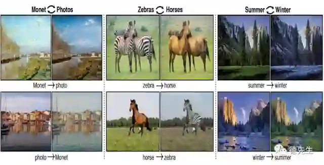 Zhu等[29]提出了CycleGAN,在不存在成对训练样本的情况下,学习将源领域图像转换成目标领域图像。GAN通常只有一个生成器和一个判别器,CycleGAN却有两个生成器和两个判别器。一个生成器(用G表示)将X域的图像转换成Y域的图像,另一个生成器(用F表示)将Y域的图像转换成X域的图像。两个判别器DY和DX试图分辨两个域的真伪图像。由于在结构上施加了循环一致性约束,CycleGAN可双向转换不丢失信息,转换后的图像不但真实,而且包含原图像的信息,避免了模式塌陷问题。CycleGAN是一种通用方法,可以应用到许多图像到图像转换任务中,包括风格迁移、目标变形、季节转换、照片增强等。图9显示了CycleGAN的实验效果。