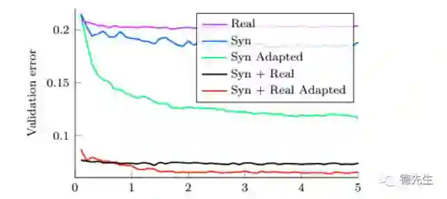 我们借用Ganin等[31]提出的一个例子,来解释上述三种领域适应策略的效果。这个例子是关于训练深度CNN来识别43类交通标志,作者评价五种模型训练方法。图10显示了在训练迭代过程中,验证错误的变化曲线。图10 中,Real和Syn表示可用的带标记数据(430幅实际图像和100000幅人工图像),Adapted表示利用大约31000幅无标记的目标领域实际图像进行领域适应,半监督领域适应策略获得的性能最好。由于带标记的实际图像规模太小(只有430幅),单纯利用带标记的实际图像,训练的模型产生最高的验证错误。利用100000幅带标记的人工图像,训练的模型能够小范围地降低验证错误,但是由于数据集偏移,验证错误仍然很高。利用无监督领域适应策略,虽然缺少来自目标领域的带标记数据,大幅下降验证错误。监督领域适应策略进一步提高性能。最终,半监督领域适应策略获得的性能最好,也许因为利用最多的数据。这个例子充分说明领域适应对于模型学习与训练的重要性,其中半监督领域适应策略最有效。