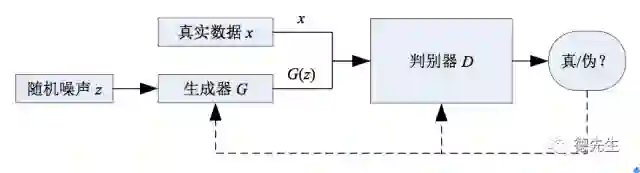 GAN的计算流程与结构如图6所示。任意可微分的函数都可以用来表示GAN的生成器和判别器。我们用可微分函数D和G来分别表示判别器和生成器,它们的输入分别为真实数据x和随机变量z。G(z)则为由G生成的尽量服从真实数据分布