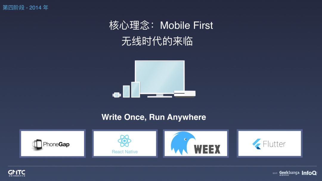 第四个阶段我相信很多人都有感触,因为移动时代的来临,改变了今天整个 PC 和无线的格局,也改变了我们前端大部分人开发的方式。