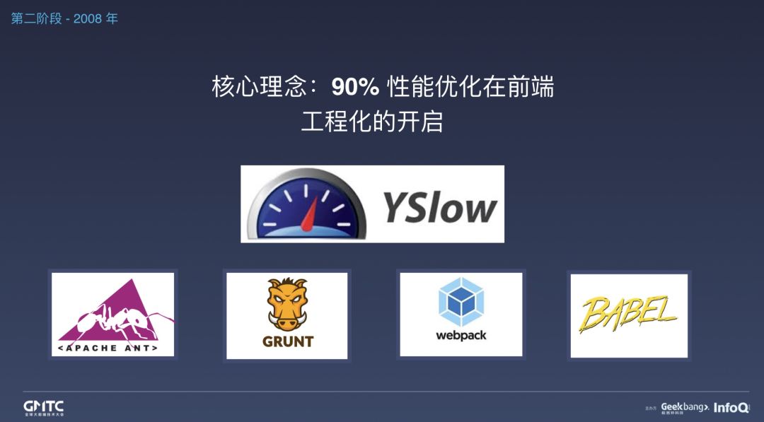但是第二阶段带来了什么?上面有写,带来了工程化的开启。怎么理解?今天要做很多性能优化,需要通过工具、流程把体系更好的工程化,然后得到一个最佳的结果。所以我认为它是一个工程化的开启。之后我们可以看到,最早用 Ant 前端工具,到今天有 GRUNT、Webpack、Babel 等。这样来看,第二个阶段是在 2008 年整个性能优化的过程,理念就是 90% 性能优化在前端。