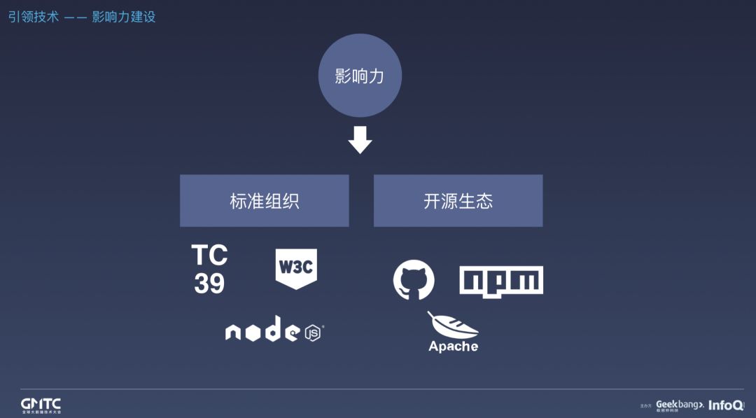 第一个途径是标准组织。跟前端相关的标准组织就三个,一个是 TC39,第二 W3C,第三是 Node 基金会。今天如何通过我们的思考,我们的能力影响今天的标准?我觉得前段时间有人跟我抱怨,说 TC39 方案不合理,我有更好的方案,可是他们就不听我的。我们如何解决这些问题?这是我们要思考的问题。