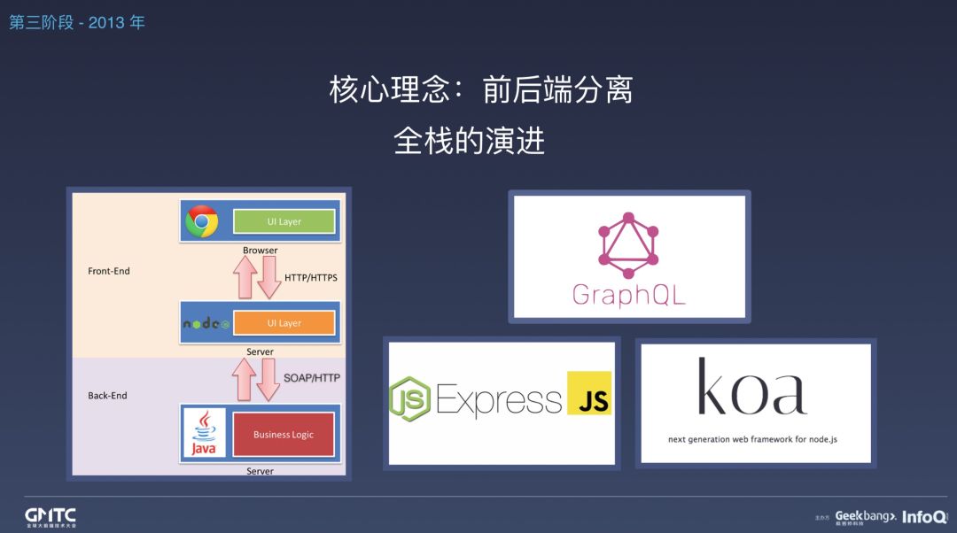 第三个阶段是 2013 年。我今天分享跟大家原来理解的阶段不一样,大家有从框架阶段来定义,也有从中间技术 W3C 什么时候出现,或者从 Node.js 什么时候出现来定义。出现并不是一个阶段。其实发现 Node.js 早于 2013 年,可能是 2008/2009 年就出现了,但是为什么那个时候没有出现变化?换到今天,我们更愿意用另外一个词就是前后端分层,在后端体系里面让前端更加专注前台的 UI 层、逻辑层,后端关注后台的接口,让我们之间分工更加明确。后端如果开发一个页面,跟前端说页面有问题,但是前端一看是后端把标签写错误了,这就是合作方式不合理。