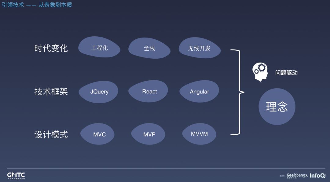刚才我讲时代变化的时候,我的理论是,因为它有一个理论支撑了一个时代变化。框架也一样,框架一定会有基于某个问题解决他的问题。React.js 解决了什么?就是最开始很痛苦,然后就用别的方式重构。无论以前讲的 MVC、MVP 还是 MVVM。大家说以前这个东西我提过,但是最后变成公共标准不是我,而是别人。