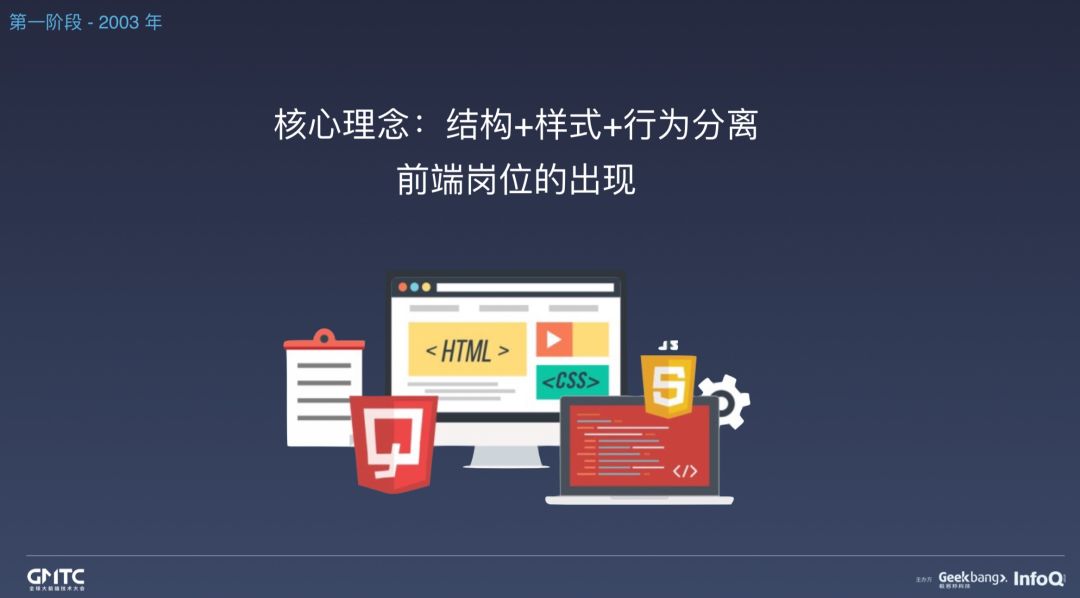 第一阶段放在 2003 年。大家那个时候都知道,那个时候讲求所有的 HTML、CSS、JS 是我们所谓结构样式行为的分离,这个理论造就了今天前端主体。