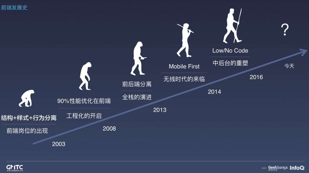 我们回顾可以看到:2003 年结构样式行为分离,预示着前端岗位的出现。2008 年 90% 性能优化在前端,开启了工程化。2013 年前后段分离,带来了全栈的演进。2014 年 Mobile first 是无线时代的来临。2016 年 LOW/NO Code 出现,带来了中后台的重塑。