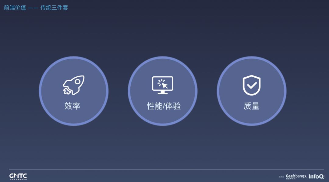 传统三件套也是今天很多团队在做的:如何提升前端效率,让资源变得更加的高效?如何做性能优化、体验优化?很多团队都在做性能优化。另外如何保障产品的质量等等。这是作为一个开发岗位最基本应该做到的。