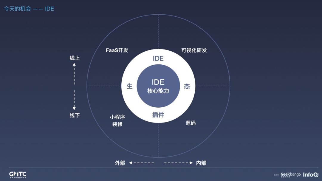 当然如果仅仅是面向内部,IDE 还达不到作为整个集团的四大方向之一。比如说还有很多 ISV,很多小程序开发、互动的开发、一些工作的开发,我们也提供 IDE 给 ISV 的,但是那个体系是内部的精简版。如果今天把整个 IDE 从内到外全部打通,就是基于一套完整的架构,然后基于上面的能力内外都可以互通,可以带来整个生态的能力提升。