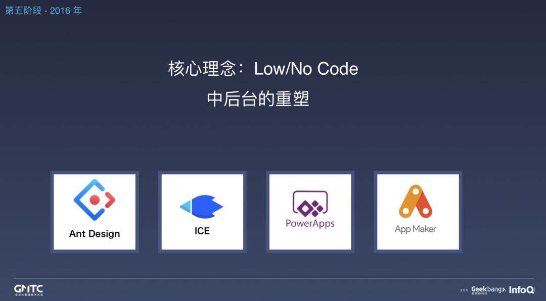 这里有一个背景就是互联网下的风口,所有的企业都看 to B 的体系,无论是阿里还是京东,to B 的体系有一个什么样的东西?其实我们在前端的体系里面把 to B 看成是中后台,那里面有什么样的特质?比如说布局是高度标准化的,它的表单是高度标准化的,它的表格是高度标准化的,它的可视化图表是高度标准化……这个体系存在大量的标准化,而不像 C 端多样化,这个体系里面,如何用低代码或者无代码的体系来完成对这个体系的重塑,这是在 2016 年重点看待的事情,也是 2016 年给我们带来很多的变化。今天很多公司提供这样的解决方案,比如说今天微软的 PowerApps,大家在这个领域在做新的探索。