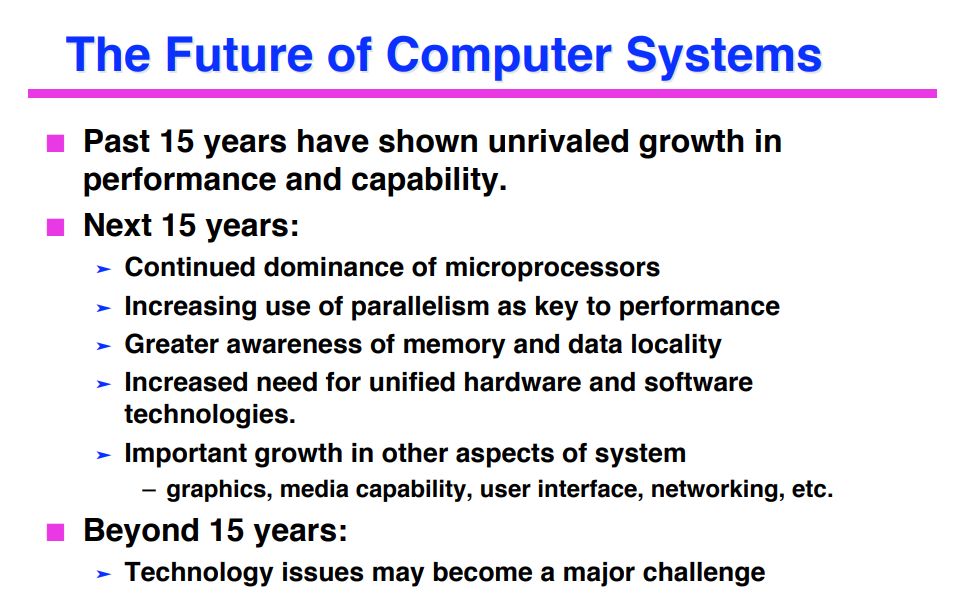 早在1998年,恰好20年前,Hennessy在他“ISCA 25: Looking Looking Backward, Looking Forward”的演讲中就指出,接下来15年需要增加并行计算提升性能,要增强软硬结合。这些预测现在看来都得到了证实。