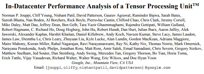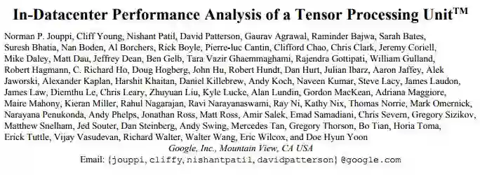 注:合影谷歌首篇TPU论文,联合75位作者,第一作者是Norman P. Jouppi,TPU总负责人,Patterson的名字排在第4位,可见贡献之大。