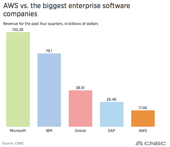 在过去几年中,亚马逊建立起了自己的云计算业务(AWS),并保持市场份额第一的地位。CNBC一篇报道称,AWS在2017年的收入跃升了43%,达到175亿美元,约占亚马逊总收入的十分之一。它已经成为世界第五大软件公司,营收排在微软、IBM、甲骨文和SAP之后。