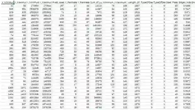 该数据集包含了7种带钢缺陷类型。这个数据集不是图像数据,而是带钢缺陷的28种特征数据,可用于机器学习项目。钢板故障的7种类型:装饰、Z_划痕、K_划痕、污渍、肮脏、颠簸、其他故障。