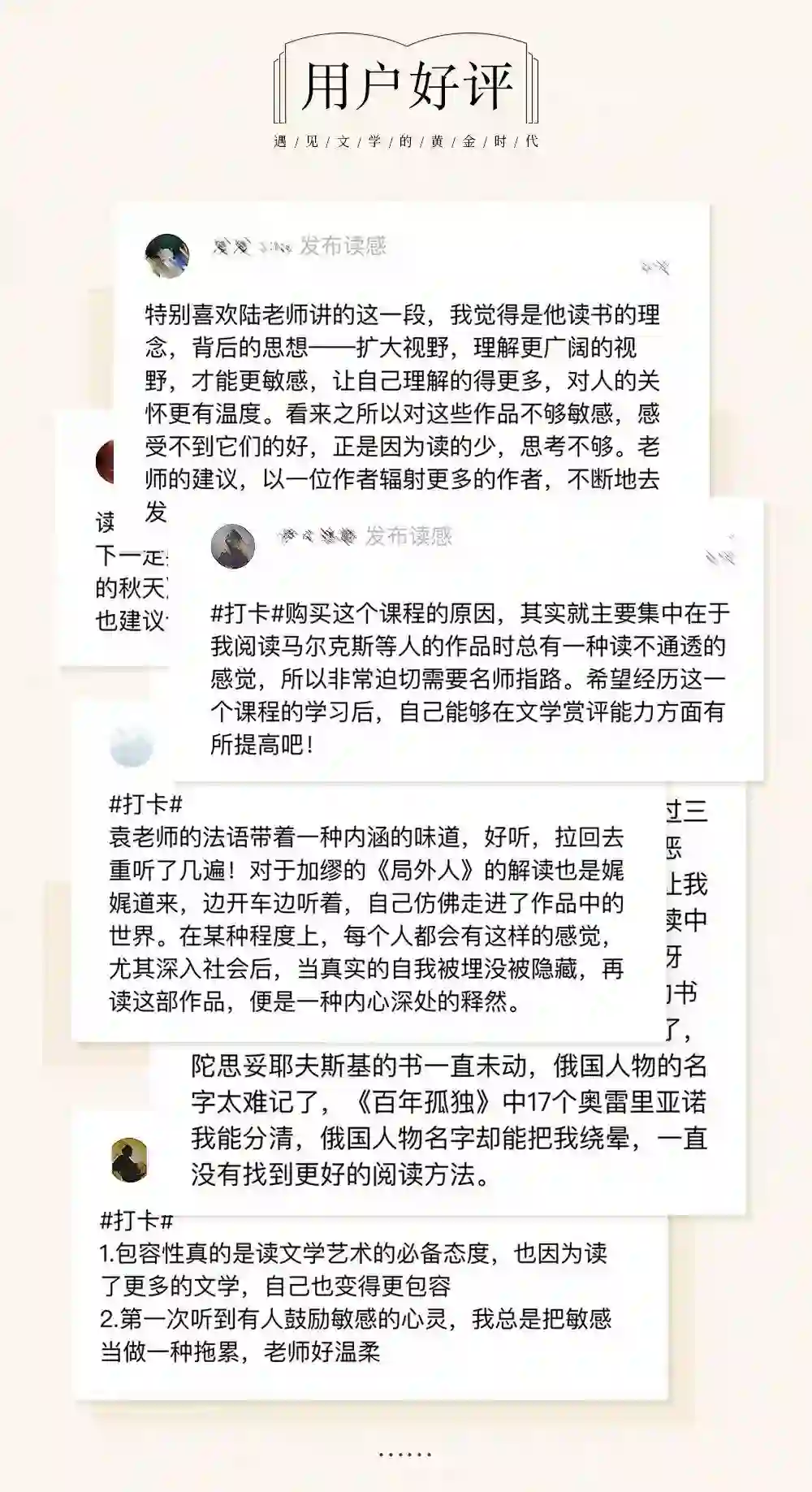在这个浮躁的时代,能为文学这个话题停留5分钟,已属不易;正如策划这样一门文学课,也需要很大的决心和毅力。因此希望在这里,我们能与那个对文学仍心怀信念的你相遇,一起回到那个文学的黄金时代。
