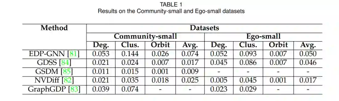 可扩展性。大量实践中的边扩散对于巨大的现实世界图是不可行的,因为它需要反向扩散的二次增长步骤来采样新的图。当节点数增加到[52]时,扩散生成新图的代价急剧增加。这一计算瓶颈使得使用基于扩散的方法生成大规模图具有挑战性,限制了其应用于现实世界中常见的大型图。尽管人们已经努力通过扩散节点的潜在表示来缓解该问题,但通过扩散生成的图远不能扩展,需要进一步探索。