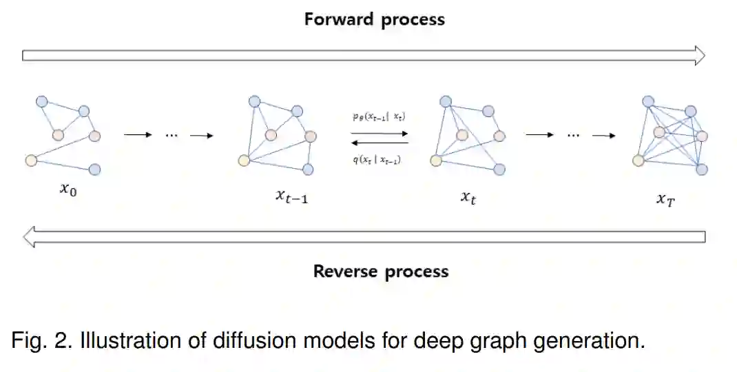 大量的工作涵盖了基于自回归、VAE和GAN模型[25]、[26]、[27]、[28]的图生成技术。然而,文献缺乏对这一任务的全面回顾,对新兴的和有希望的扩散模型进行降级。在本调研中,我们努力弥补这一知识差距。本文通过从图生成的角度简要总结上述方法以及它们在第2节中面临的挑战来解决这一问题。该综述然后推进到基于扩散的方法的主要主题,第3节简要介绍了扩散模型,然后在第4节和第5节中从结构和应用的特定角度深入讨论了它们的图生成。调查在第6节中解释了目前流行的评估数据集和指标,在第7节中总结了研究界仍然面临的挑战和研究问题。通过撰写这份深入的调查,希望为有兴趣探索扩散模型在图生成和相关任务中的潜力的研究人员提供一个全面的资源。相关调研工作。[29],[30],[31]综述了扩散模型在各个领域的研究进展。还有多种扩散模型的领域特定综述工作,包括文本到图像的扩散模型[32]、音频扩散模型[33]。作为补充,本文对图扩散模型进行了调研。从AI生成内容(AIGC)的角度来看,这项调查也与生成AI(见[34]的调查)和ChatGPT(见[35]的调查)有关。从概念上讲,扩散模型也与掩码自动编码器高度相关(参见[36]的综述),后者也进行去噪。