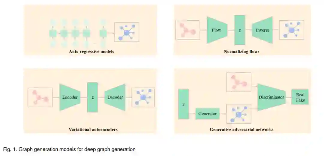 生成模型,如Erdos-Renyi[37]、WattsStrogatz[38]、barabsi - albert[39]和R-MAT[40],会手动观察实际图的特定重要属性,并据此构建算法。虽然这些模型可能成功地捕获了实际图的一些特征,但它们缺乏灵活性来建模不同的图属性[4],[16],[41],[41]。此外,生成模型可能难以生成表明观察到的连接模式或[42]行为的图。因此,需要开发更复杂的生成模型,以集成更全面的图属性范围,并产生更真实的结果[43]。在本节中,我们根据算法分类简要回顾了深度图生成模型。无论数据类型如何,有四种流行的生成式建模方法,分别是自回归模型[44]、变分自编码器[45]、归一化流[46]和生成式对抗网络[47]。在这里,我们总结了深度图生成模型的统一框架,如图1所示。