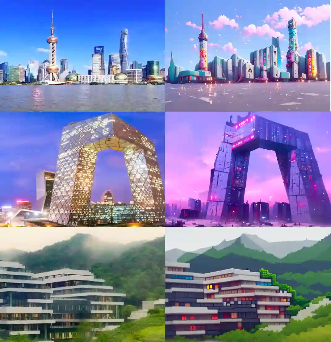 通过输入文本描述与地标城市底图,生成不同风格的画作(动漫风格 / 赛博朋克风格 / 像素画风格):