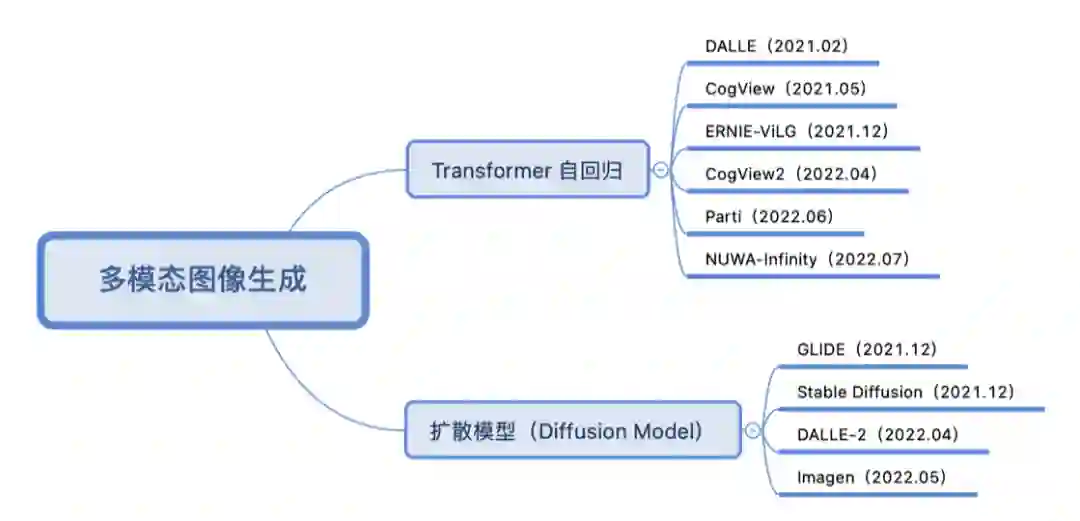 按照训练方式采用的是 Transformer 自回归还是扩散模型的方式,近两年多模态图像生成重点工作分类如下: