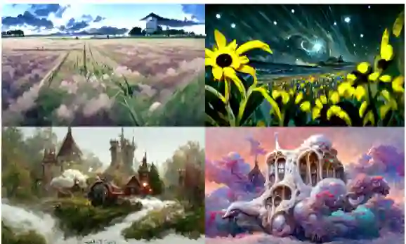 Disco Diffusion [11] 是一个在 Github 上由众多技术爱好者共同维护的 AI 艺术创作应用,目前已经迭代了多个版本。从 Disco Diffusion 的名字不难看出,其采用的技术主要是用 CLIP 引导的扩散模型。Disco Diffusion 可以根据指定的文本描述(和可选底图)来生成艺术图像或视频。比如输入“花海”,模型就会随机产生一张噪声图像,通过 Diffusion 的去噪扩散过程一步步迭代,达到一定步数后就能渲染出一张美丽的图像。得益于扩散模型多样化的生成方式,每次运行程序都会得到不同的图像,这种“开盲盒”的体验着实让人着迷。