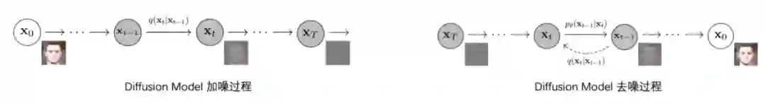 扩散模型(Diffusion Model)是一种图像生成技术,最近一年发展迅速,被喻为 GAN 的终结者。如图所示,扩散模型分为两阶段:(1)加噪:沿着扩散的马尔可夫链过程,逐渐向图像中添加随机噪声;(2)去噪:学习逆扩散过程恢复图像。常见变体有去噪扩散概率模型(DDPM)等。