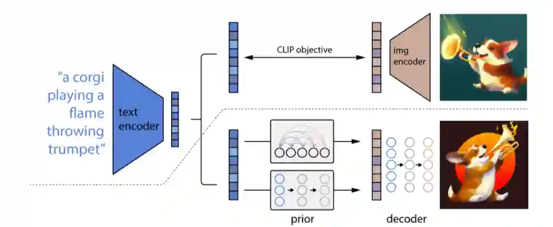 采取扩散模型方式的多模态图像生成做法,主要是通过带条件引导的扩散模型学习文本特征到图像特征的映射,并对图像特征进行解码得到最终生成图像。以 DALL-E-2(OpenAI)[7] 举例,其虽然是 DALL-E 的续作,但是采取的技术路线与 DALL-E 截然不同,其原理更像是 GLIDE [8](有人称 GLIDE 为 DALL-E-1.5)。DALL-E-2 的整体架构如图所示: