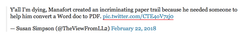 根据律师调查:Manafort想要篡改自己公司的经营收入,但他自己搞不明白如何修改PDF文件,因此,他让Gates把这份文件转换成Microsoft Word文件,在这个过程中,他们一直通过电子邮件的方式进行文件传送。而恰恰是这一方式,正如律师Susan Simpson在推特上所述,“Manafort无法独立完成一个最基本的任务,从而创造了一个罪证。”