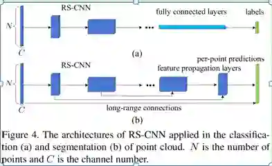 图 4 展示了 RS-CNN 应用于点云分类和点云分割的网络框架。将所提出的几何关系卷积方法搭配均匀的点云下采样算法,可以很容易实现类似图像 CNN 的多层神经网络,相关操作简单高效。