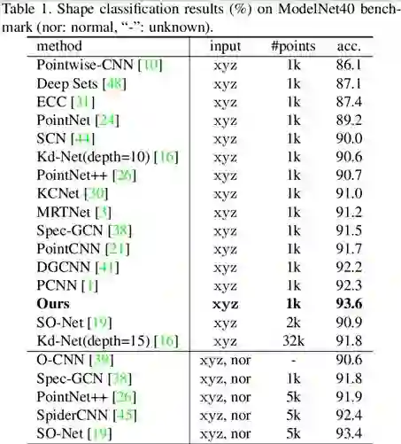 为了验证 RS-CNN 的有效性,我们在主流的点云分析任务上进行了测试,包括点云分类、部件分割和法向预测。ModelNet40 上的分类结果如表 1 所示,在仅使用 3D 坐标 xyz 和 1k 个稀疏点作为输入的情况下,RS-CNN 仍然实现了最佳分类效果。