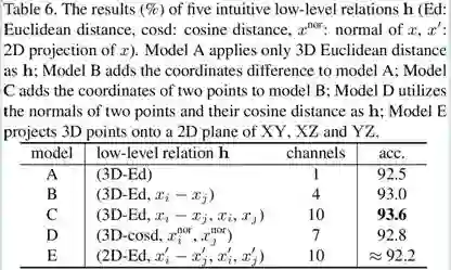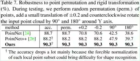 为了验证所提出的几何关系卷积的鲁棒性,我们设置几何先验 hij 为 3D 欧式距离,然后在 ModelNet40 上进行鲁棒性测试,结果如表 7 所示。虽然几何关系 hij 能够做到旋转不变,但网络初始输入的特征 xyz 仍然会受到旋转的影响。针对这一问题,我们引入法向将每一个局部点集旋转到以法向和采样点确定的局部坐标系中,实现了旋转不变。但该旋转会给形状识别带来困难,因此分类精度会有所下降。