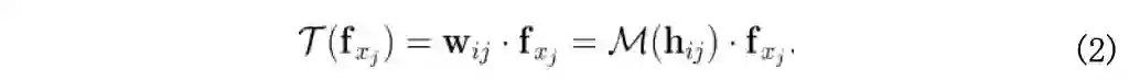 为了克服上述问题,我们将卷积转换为从几何关系中学习。在方法上,我们将 wj 替换为 wij,并让 wij 从几何关系向量 hij 中学习一个高维的映射函数 M。hij 是预先定义的点 xi 和 xj 之间的几何先验。该过程可以描述为: